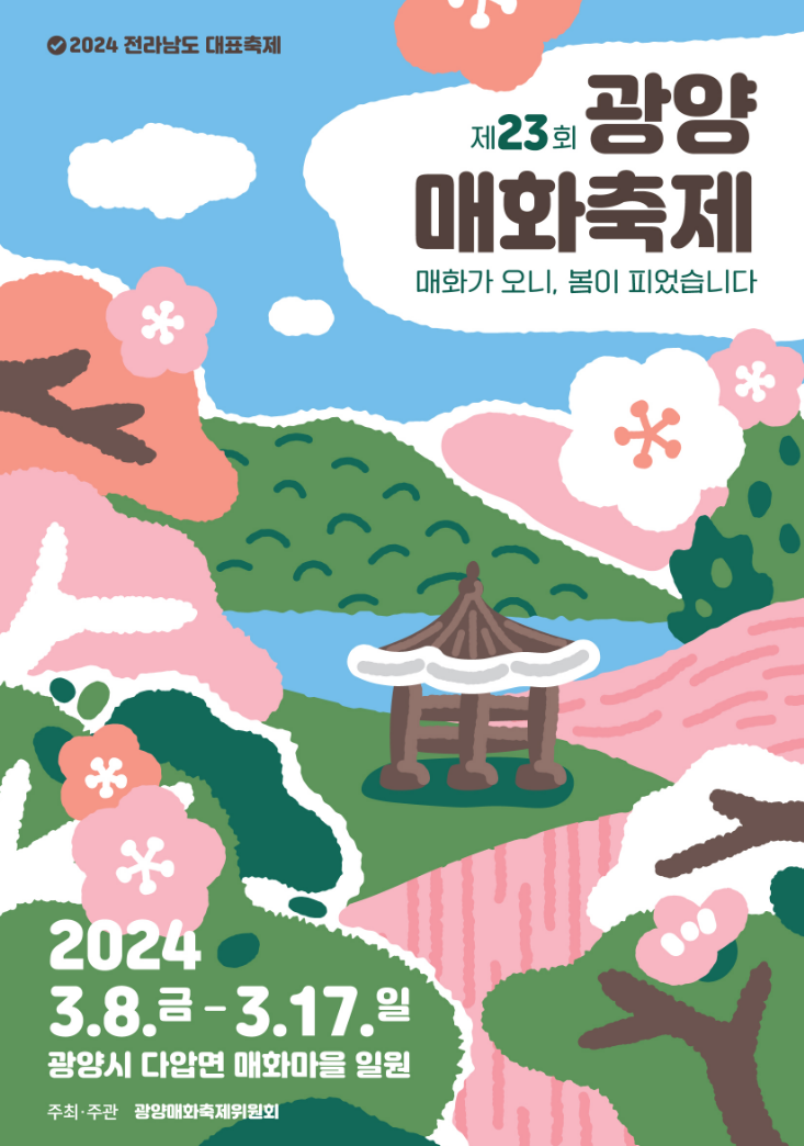 올해로 제 23회를 맞는 광양매화축제는 오는 3월 8일부터 17일까지 '광양 매화, K-문화를 담다'라는 주제와 '매화가 오니, 봄이 피었습니다.'를 슬로건 아래 차별화되고 매력적인 콘텐츠로 방문객을 기다립니다.
