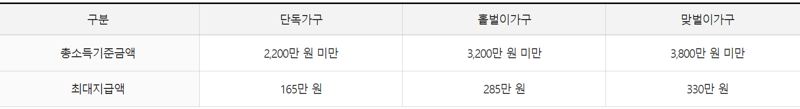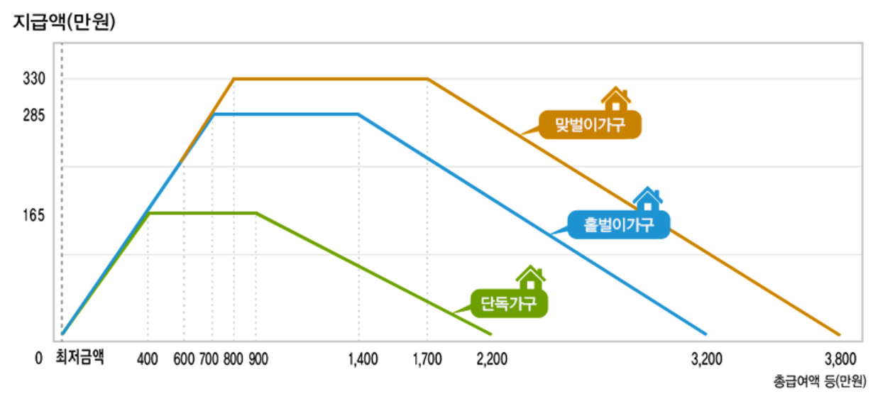 가구원의 형태별로 지급받으실 수있는 금액에 차이가 있습니다. 단독 1인가구는 최대 165만원, 홑벌이 부부는 최대 285만원, 맞벌이 부부는 최대 330만원을 각각 받을 실 수 있습니다.