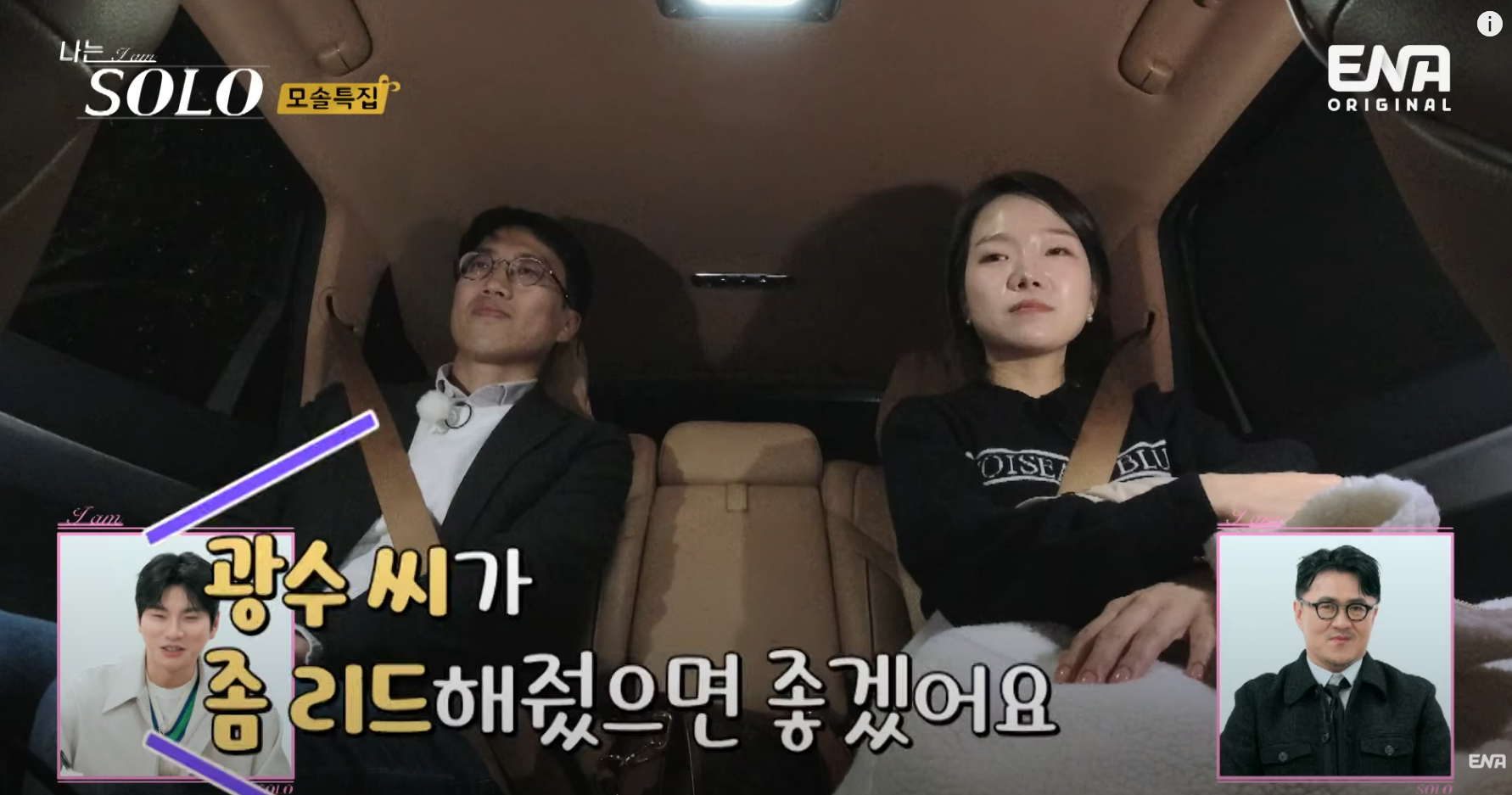 가장 먼저 데이트에 나선 광수, 영숙은 차 속에서 어색한 기류 속 침묵을 지킵니다. 그러다 영숙은 “매력 있는 사람인데 좀 위축되신 것 같다. 자기소개를 했을 때처럼 자신감 있게 말하면 여자들도 충분히 매력을 느낄 것”이라고 광수를 띄워줍니다.