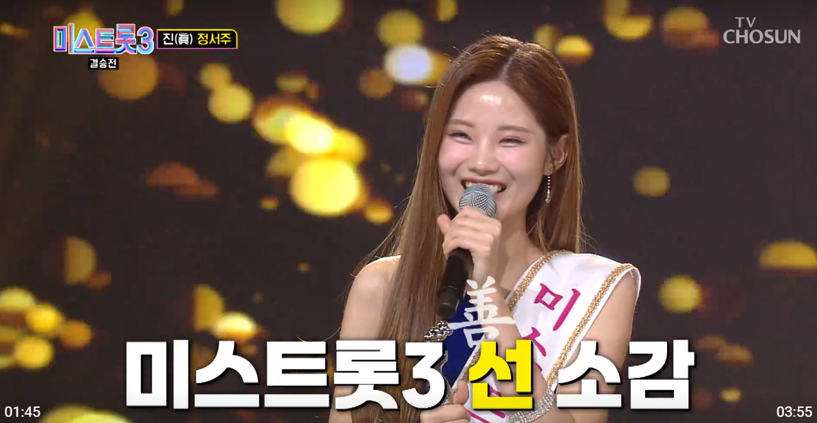 미스트롯 3 진은 정서주, 선은 배아현, 미는 오유진, 4위 미스김, 5위 나영, 6위 김소연, 7위 정슬이 차지했습니다.