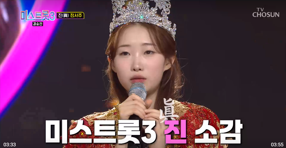 1위 진과 2위 선의 점수차는 불과 22점이었습니다. 송가인, 양지은을 잇는 '미스트롯 3' 제3대 트로트 여제에 등극한 주인공은 정서주였습니다. 고등학교 1학년 생으로 최연소 진인 정서주는 "아직 부족한데 이렇게 많은 관심과 사랑을 주셔서 감사드린다"라면서 가족, 마스터, 제작진에 대한 고마운 마음을 전하며 감격의 눈물을 터트렸습니다.