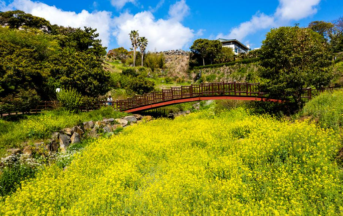 엉덩물 계곡은 중문 관광단지 내 있는 계곡으로 유채꽃 명소로 유명합니다. 계곡 경사면의 지형이 험준하여 계곡 사이 피어난 노란 유채꽃들은 입체적인 풍경이 연출되는데요. 완만한 나무 데크와 잘 가꾸어진 산책로로 꽃을 즐기면서 걷기 좋고, 아치형 다리 위로 올라가면 중문 색달 해변이 함께 보이는 멋진 전망도 한눈에 담아볼 수 있습니다.
