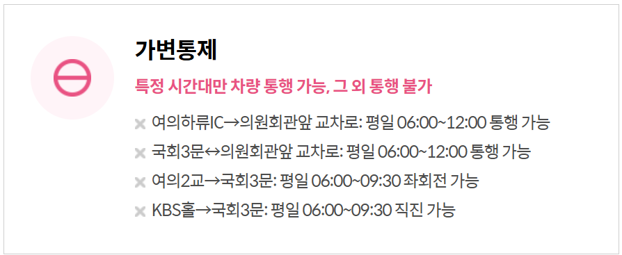 - 국회3문 ↔의원회관 앞 교차로 : 평일06:00~12:00통행가능