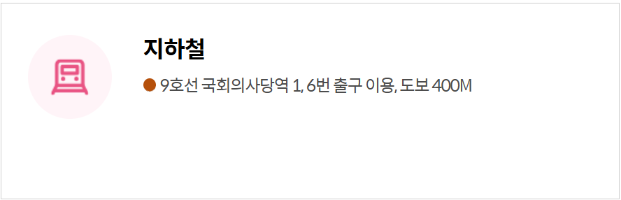 - 지하철 : 9호선 국회의사당역 1,6번역 출구 이용(도보 400M)
