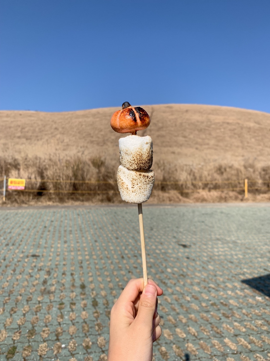 설 연휴 제주 가족여행 코스 1. 새별오름. 앞쪽으로 주차장이 잘 마련되어 있고, 주차장 입구에는 푸드트럭이 있어 다양한 간식거리를 먹을 수 있습니다. 새별오름을 내려와서 출출한 우리 아이들은 마시멜로 꼬치를 하나씩 맛있게 냠냠합니다. ~^^