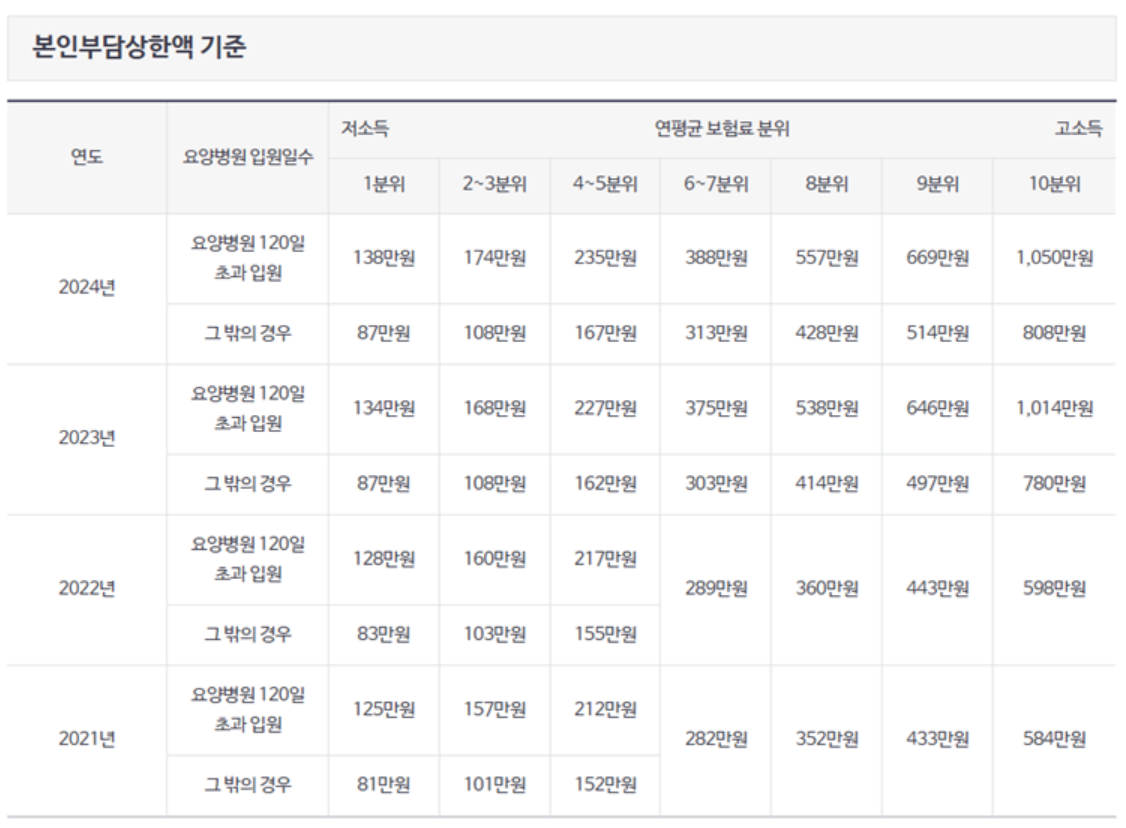 개인별 상한액은 직장가입자의 저년도 보험료 연말정산(매년 4월 말), 개인사업장 대표자의 종합소득신고(매년 6월 말) 시기를 고려해, 매년 8월경에 본인 부담 상한액을 결정합니다.