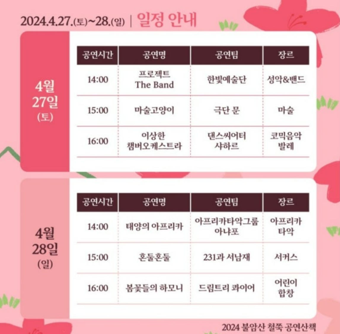 이번 축제는 '철쭉, 봄을 열다'라는 주제로 다양한 프로그램과 볼거리, 즐길거리, 먹거리 등이 제공됩니다. 따라서 서울 근교 철쭉 축제를 통해 가족 나들이, 주말 나들이, 커플 데이트 등 힐링을 할 수 있는 최적의 장소가 될 것으로 기대됩니다.