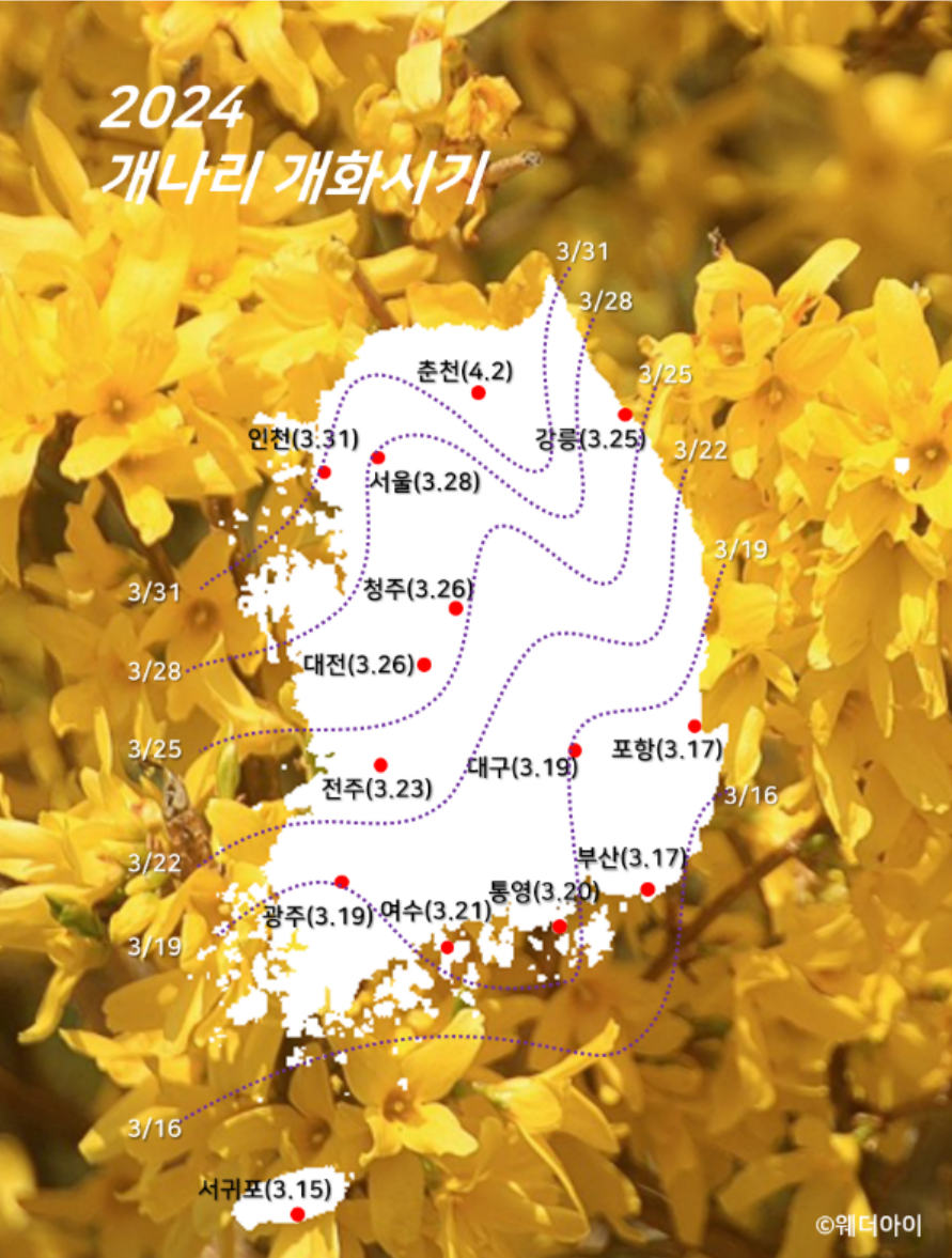 개나리는 따뜻한 서귀포에서 3월 15일을 시작으로 남부지방은 3월 17일~23일, 중부지방은 3월 25일 ~ 30일, 비교적 기온이 낮은 경기 북부와 산간지방은 4월 2일 이후에 개화한다고 합니다. 서울은 3월 28일경 정도가 되면 개나리가 활짝 피어있을듯합니다.