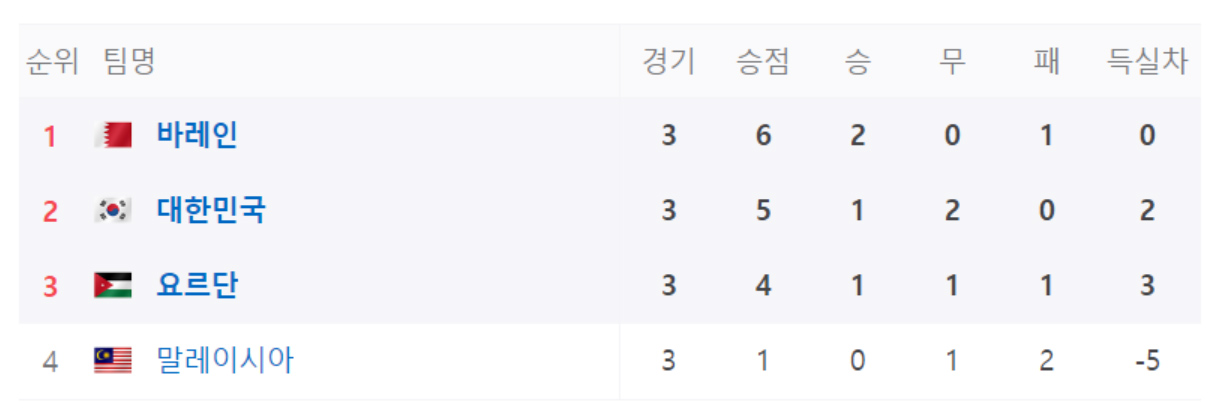 현재, 1승2무, 조 2위로 16강에 안착된 상태입니다. 지난 15일 바레인전에서 3:1로 승리하고, 20일 요르단전에서 2:2로 무승부를 기록했으며, 26일 말레이시아 전에서도 3:3 무승부를 기록하며 다소 아쉬운 성적으로 예선전을 마무리했습니다.